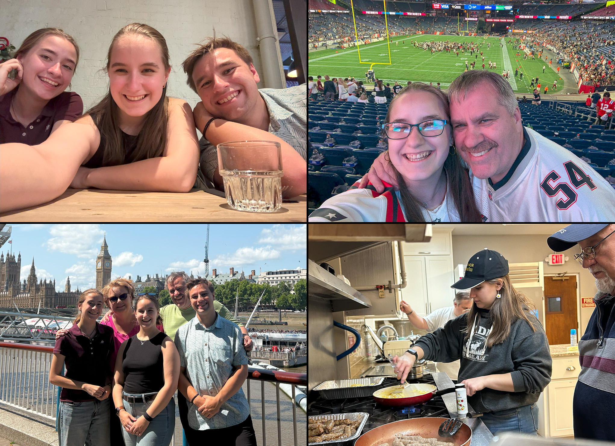 Left: Sarah with siblings and family in London. Top Right: Sarah with dad at a Patriots Game. Bottom Right: Sarah with grandfather cooking for church function.
